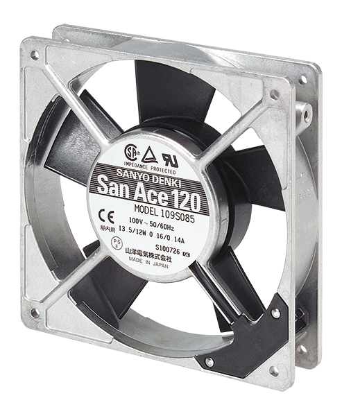 The San Ace 109S085 is a 120 × 120 × 25 mm AC cooling fan engineered for high-reliability thermal management in compact enclosures. Built with a shaded-pole coil motor and designed for 100V AC input, this fan offers a balance of quiet operation, strong airflow (up to 81.3 CFM), and long service life.