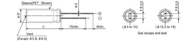 The following specifications shall be satisfied when the capacitors are restored to 20 ºC after exposing them for 500 hours at 105 ºC without voltage applied. Before the measurement, the capacitor shall be preconditioned by applying voltage according to Item 4.1 of JIS C 5101-4. Capacitance change: ≤ ±25% of the initial value (6.3, 10Vdc : ≤±30%) D.F. (tan δ): ≤ 200% of the initial specified value Leakage current: ≤ The initial specified value |