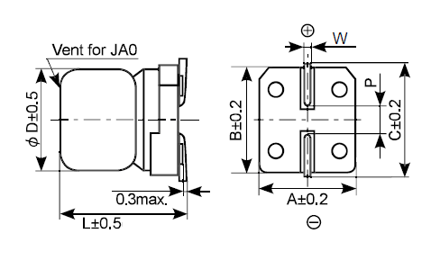 I=0.01CV or 3 µA, whichever is greater. Where, I : Max. leakage current (µA), C : Nominal capacitance (µF), V : Rated voltage (V) |