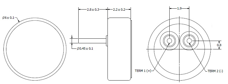 - 6 mm overall diameter and 2.2 mm height with pin terminals