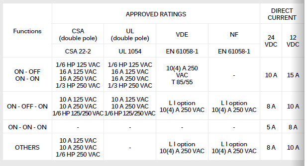 N/A Canadian Standards Association (CSA®) Recognized Component Mark (RU®) Verband Deutscher Elektrotechniker (VDE) and National Fellowship (NF) -EN 61058-1 |