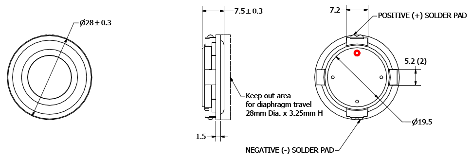 The 28 mm diameter AS02804PR-N50-R features a paper cone and foam surround for classic HiFi sound quality. Four openings on the back plate create forced-air cooling to dissipate heat from the voice coil.