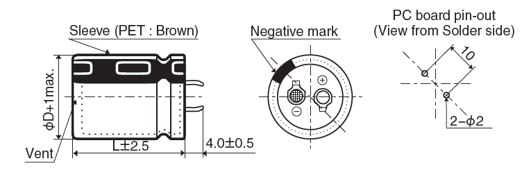 I ≤3√CV Where, I : Max. leakage current (µA), C : Nominal capacitance (µF), V : Rated voltage (V) |
