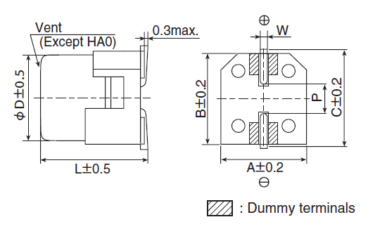 I=0.01CV or 3 µA, whichever is greater. Where, I : Max. leakage current (µA), C : Nominal capacitance (µF), V : Rated voltage (V) |